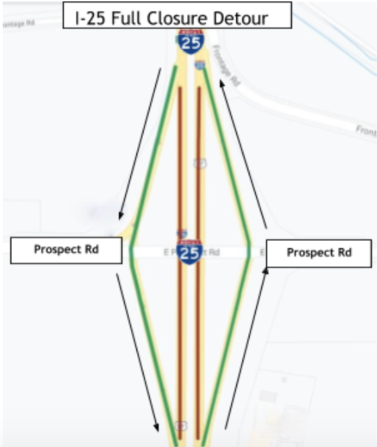 'Westbound Prospect Road traffic will be detoured north to Mulberry Street. Eastbound Prospect Road traffic will be detoured south to Harmony Road.I-25 traffic will be detoured up and over I-25 using the on- and off-ramps at Prospect Road.'